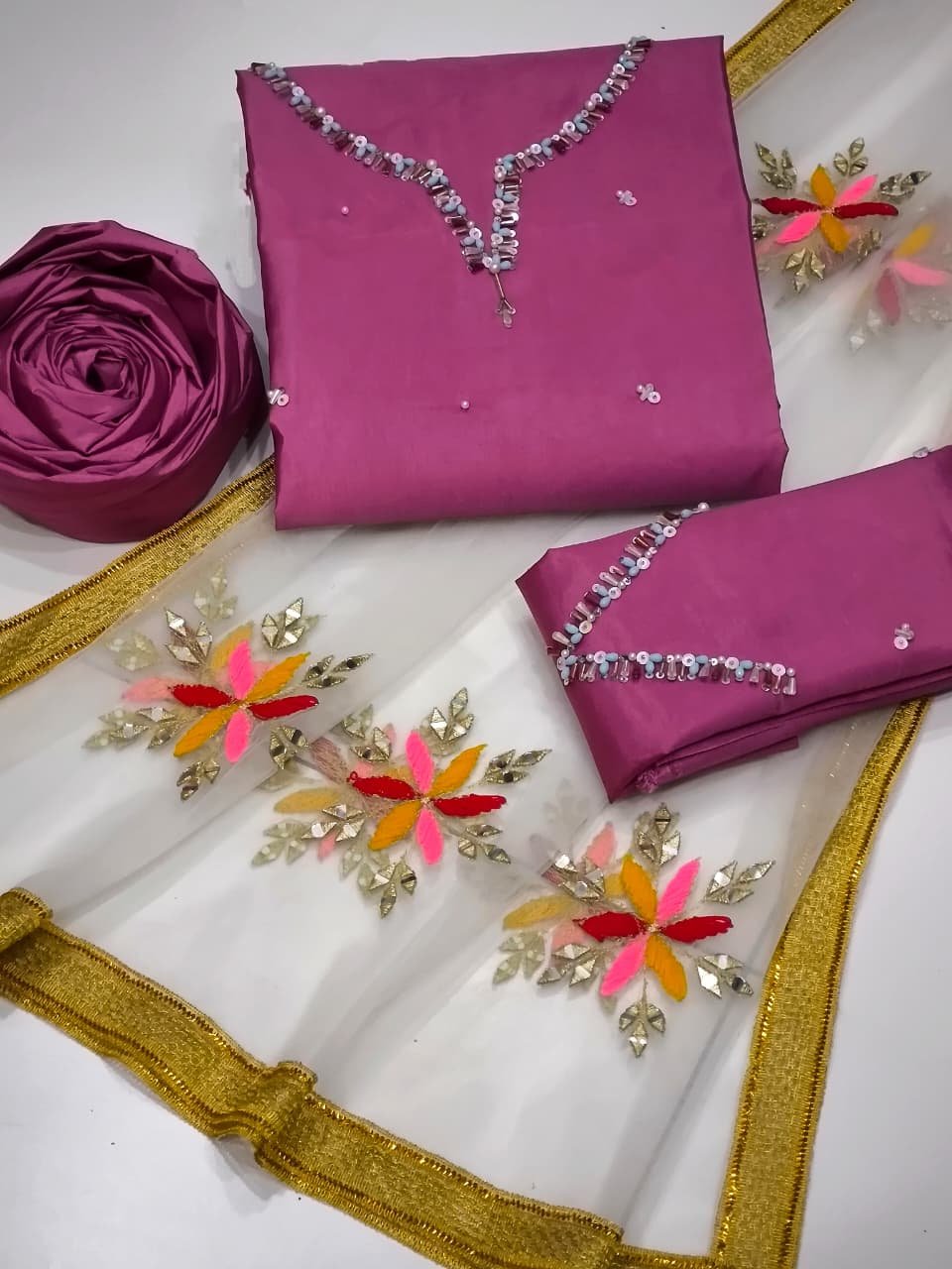 💫 NET Fabric Multi Aari work + Mirror work Duppata with 4 sided Lase