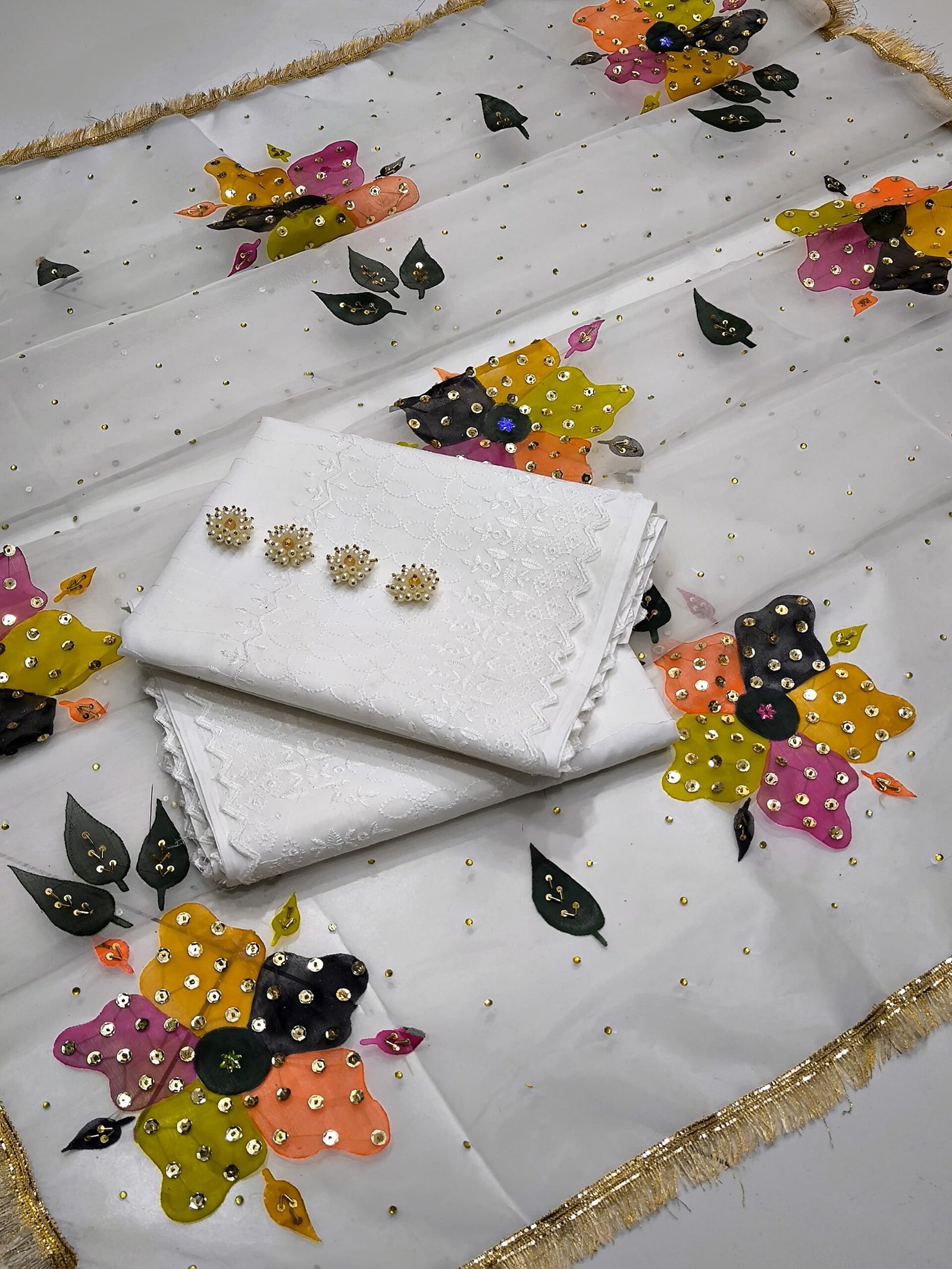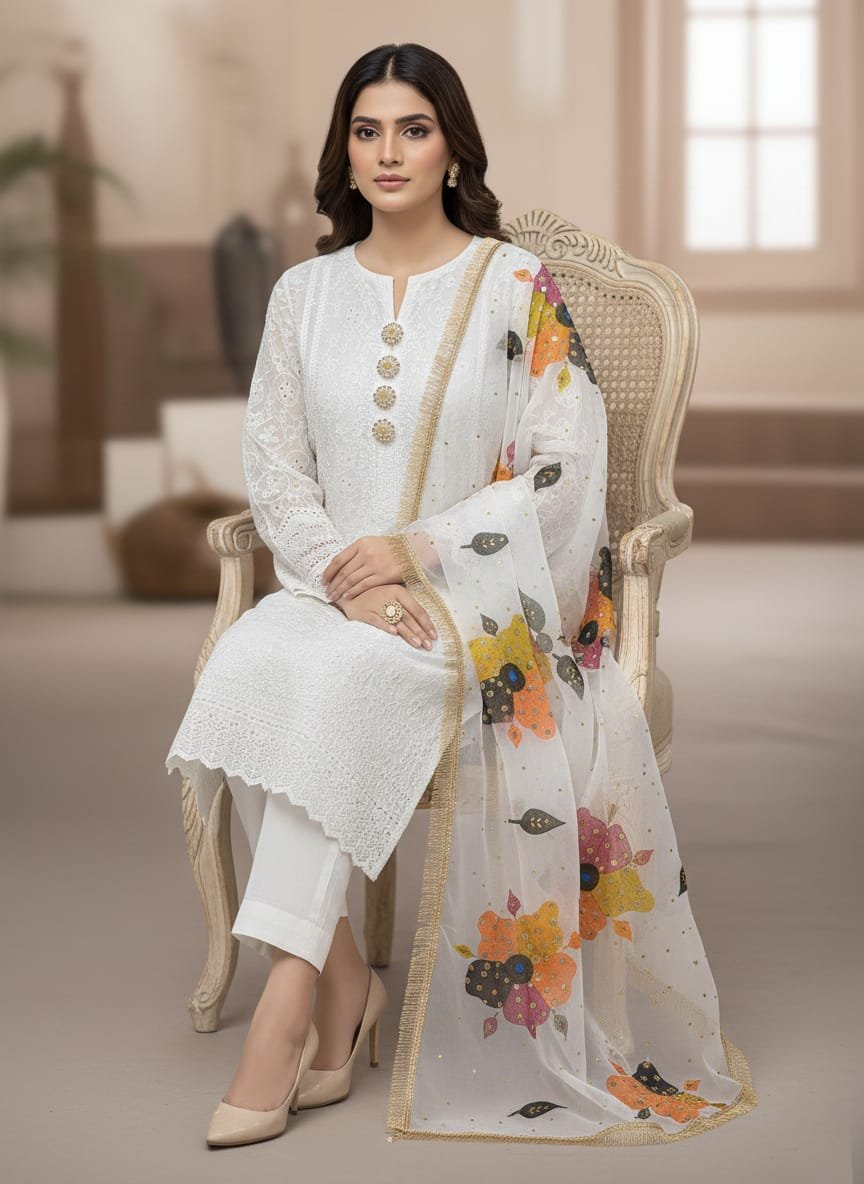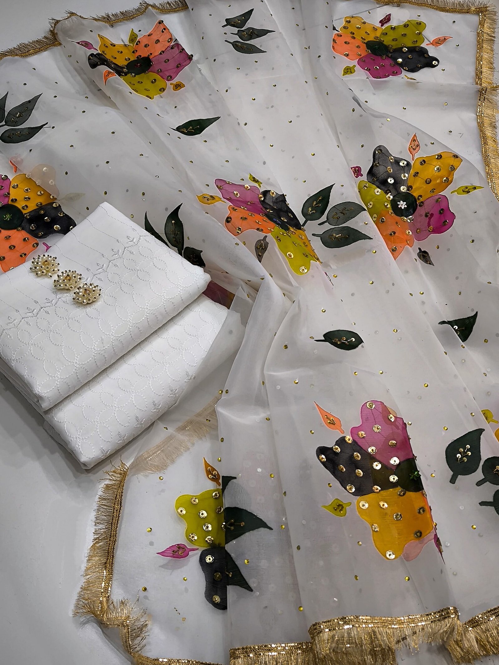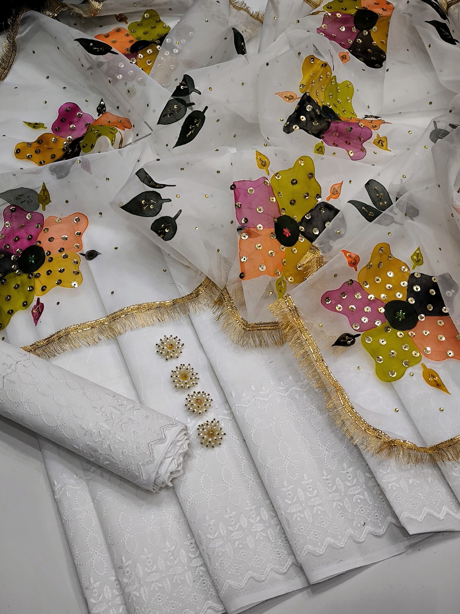 Duppata* Multii oil paint with handmade workTraditional Duppata *ShiRt & Trouser 💝💝* White Chicken Kaari 🤍 ✅ *Buttons gift 🎁* *Quality is our First Priority 😍❤️👆*